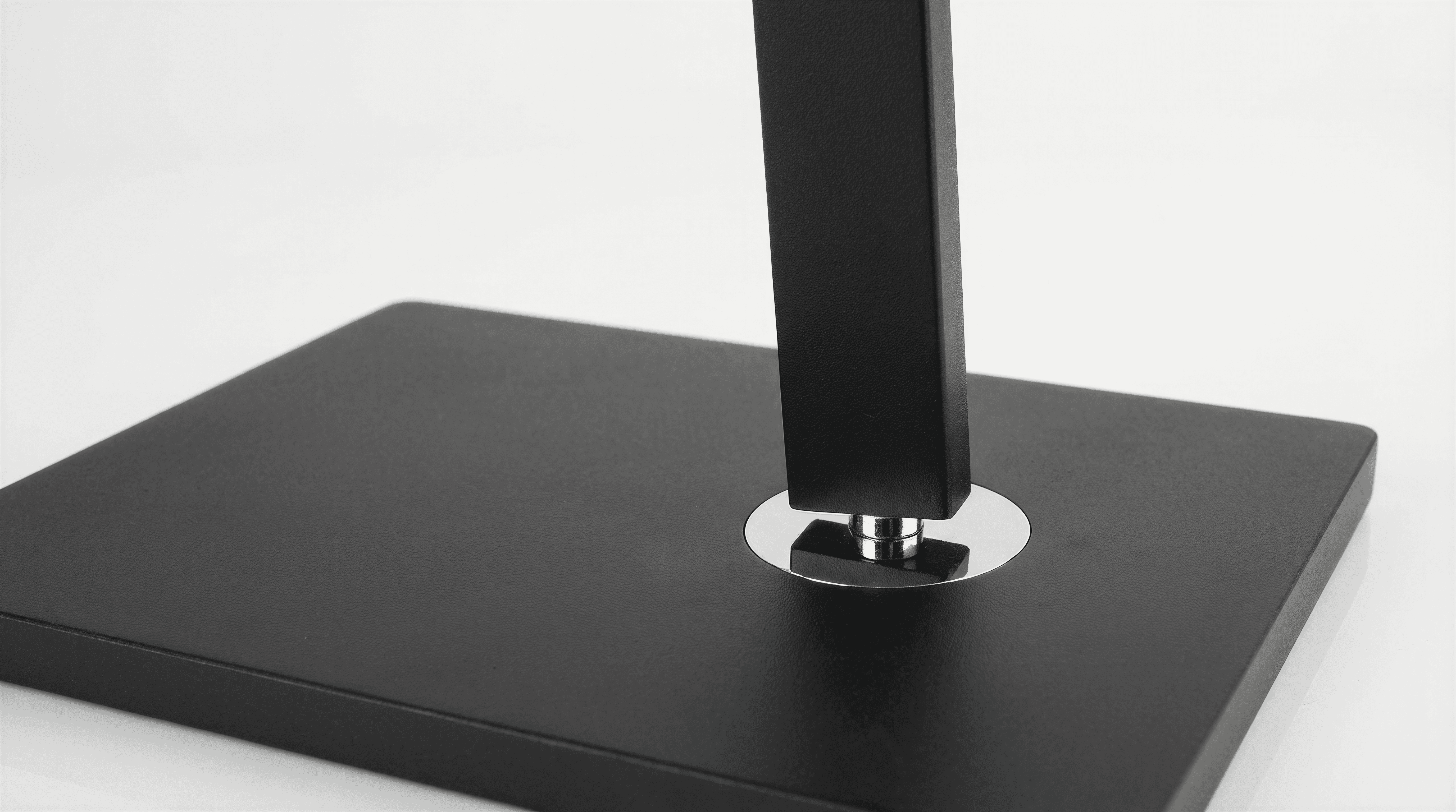 The hydraulic piston acts as both a functional mechanism and a visible structural element. The exposed piston allows smooth adjustment along the central axis and defines the lamp’s movement.